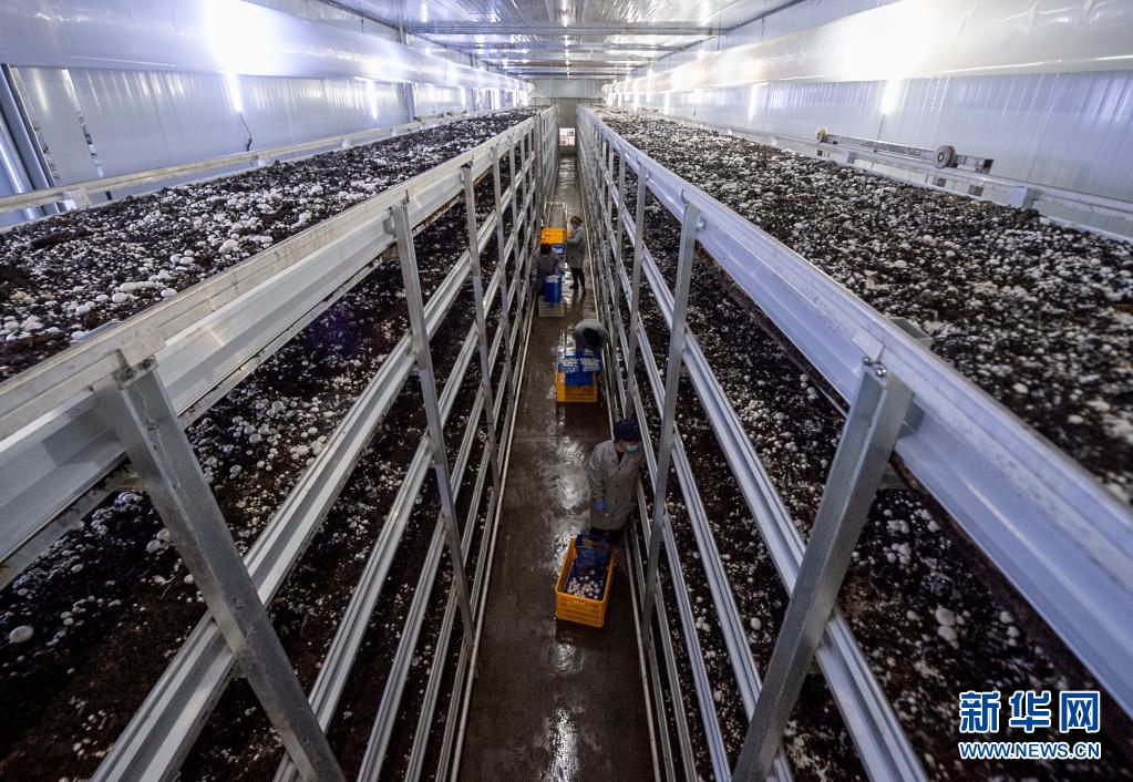 在宁夏银川市永宁县闽宁镇双孢菇栽培示范基地,农民在采摘蘑菇(2020年3月18日摄)。新华社记者 杨植森 摄