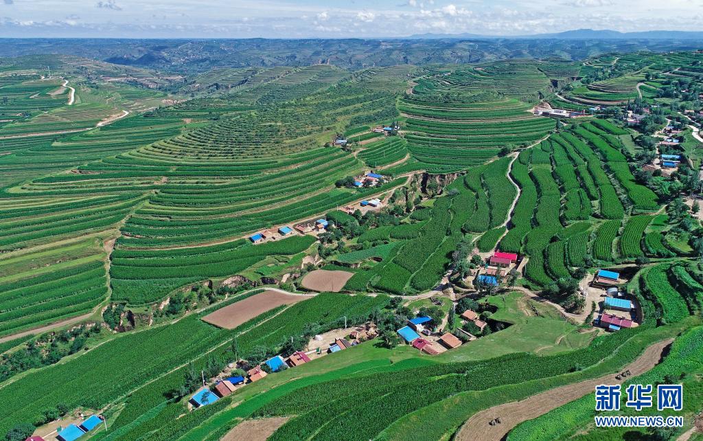 宁夏固原市彭阳县的梯田景观(2018年7月16日摄,无人机照片)。新华社记者 王鹏 摄