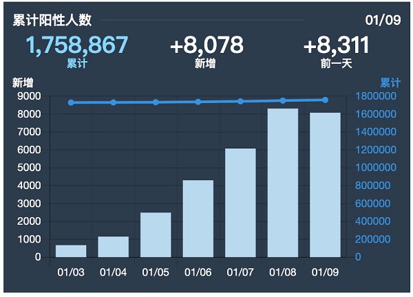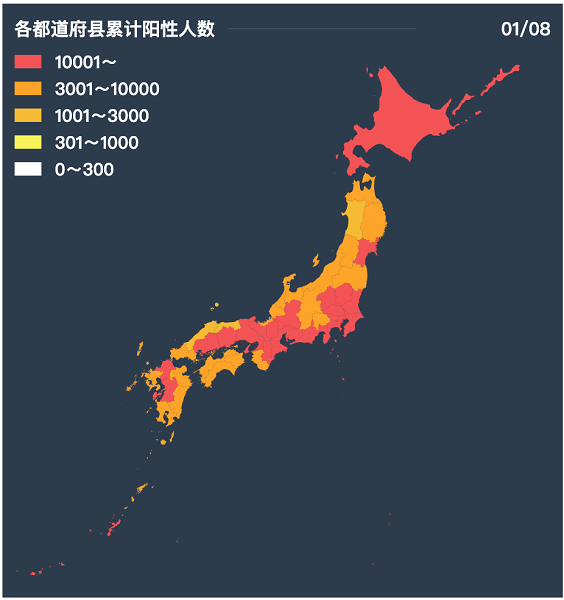 日本内阁官房网站发布的数据统计(图片来源:日本内阁官房网站) 东南网日本1月10日讯(本网特约记者 刘诗琪)据日本内阁官房网站数据统计显示,1月9日日本全国新增新冠肺炎确诊病例人数超过8000人。在1月8日日本全国新增新冠肺炎确诊病例人数已达8311人,是上周的14倍。这是日本连续两天新增新冠肺炎确诊病例人数超过8000人,新增确诊病例人数依然呈扩大趋势。 1月9日,日本东京都政府报告称,东京都新增确诊病例人数为1223人,仅比前一日1月8日少一人。东京都知事小池百合子在记者会上表示,东京都的新增确诊病例中,奥密克戎病毒感染确诊病例占比已经由4天前的44%,增涨到目前的75%以上。另外,新增确诊病例的感染者中,半数以上是已经完成2针新冠疫苗接种。从下周开始东京都将要求餐饮店每组聚餐人数不超过4人。 据了解,虽然东京都新冠疫情十分严峻,但东京首都圈依然会坚持不申请实施重点防疫措施。